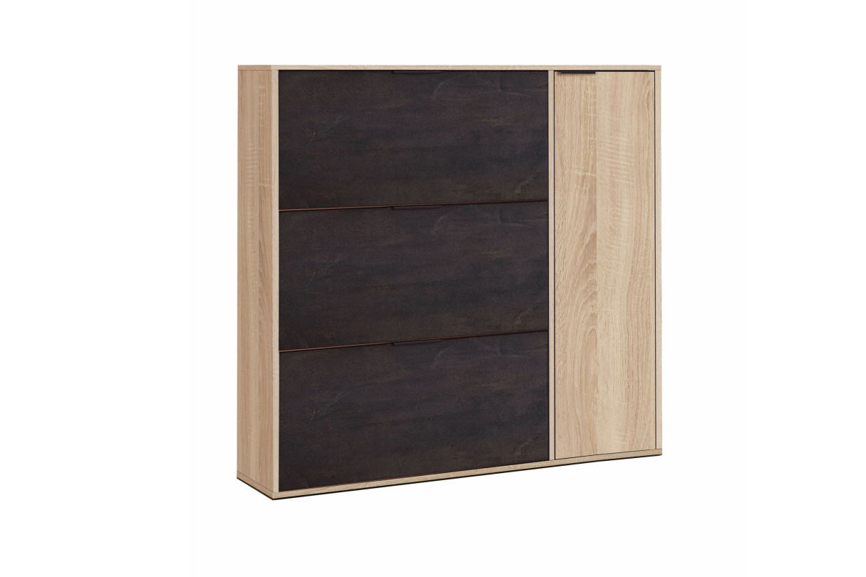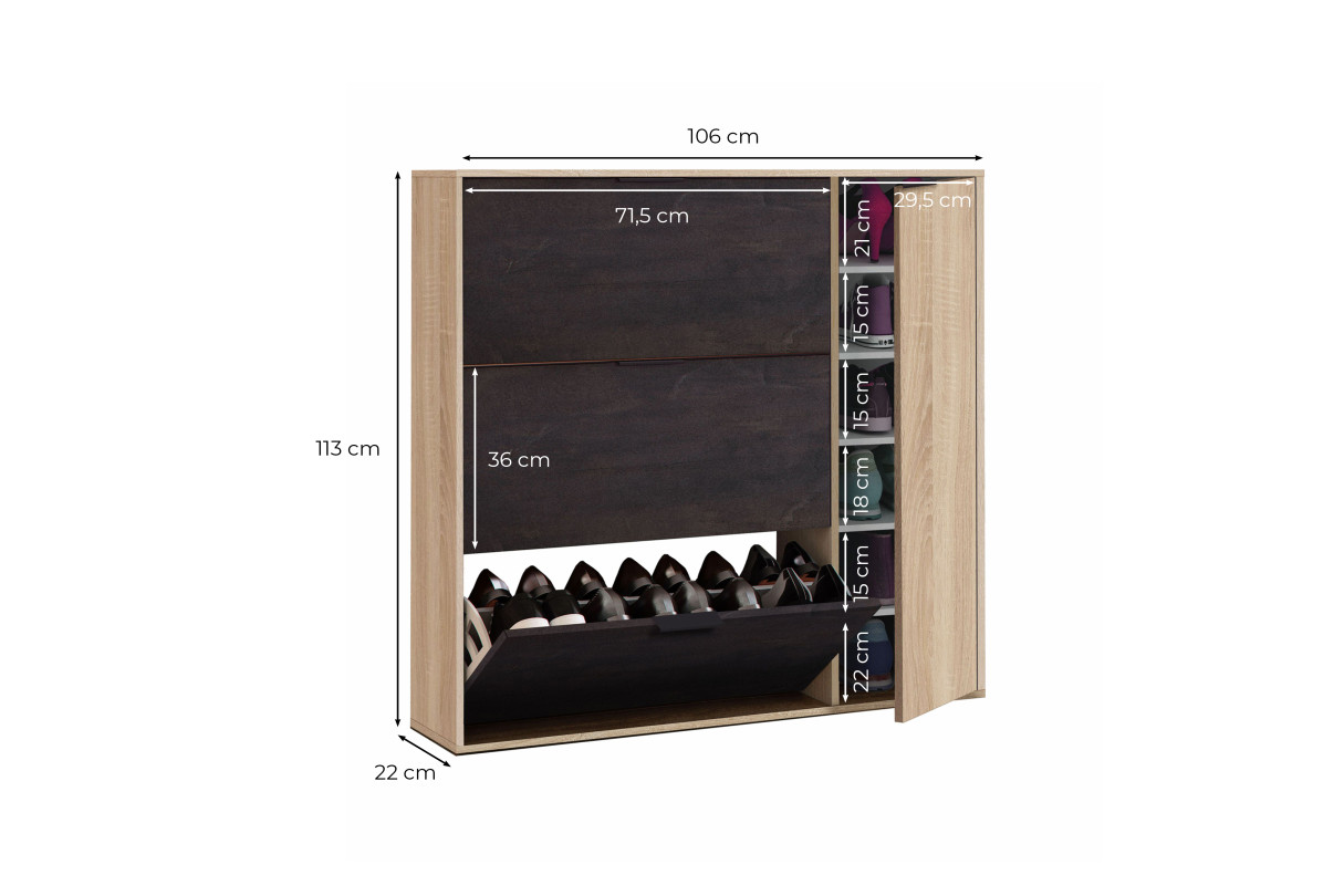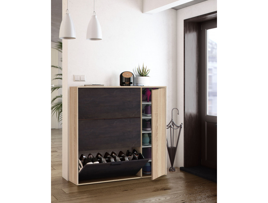FIRMIN – Meuble à chaussures 3 abattants et 1 porte (30 paires) L106 x H115 cm – Chêne clair/noir